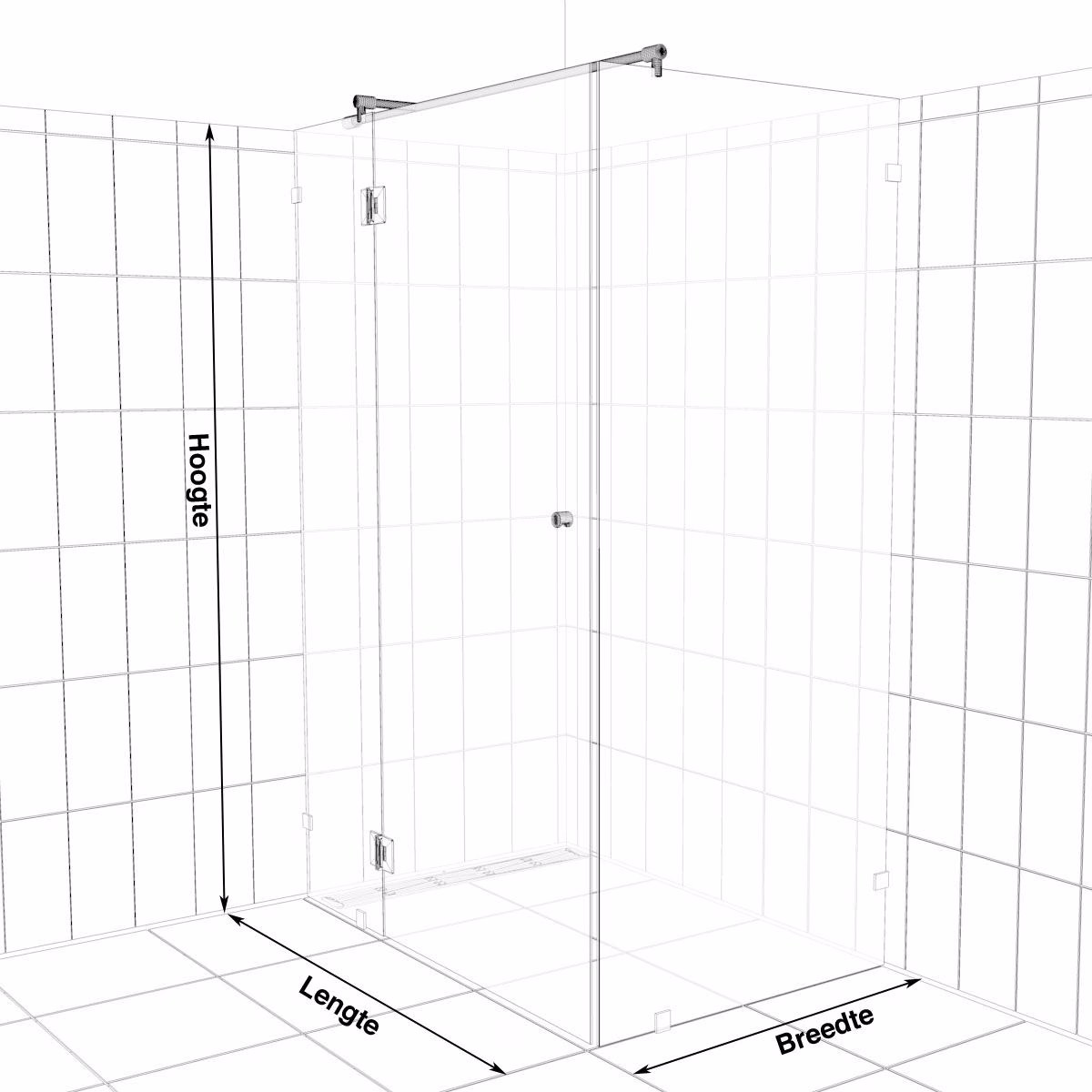 Volledig op maat gemaakte douchecabine, compleet geleverd inclusief scharnieren, deurknop, glasklemmen en stabilisatiestangen.