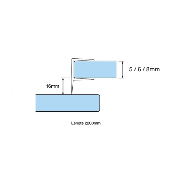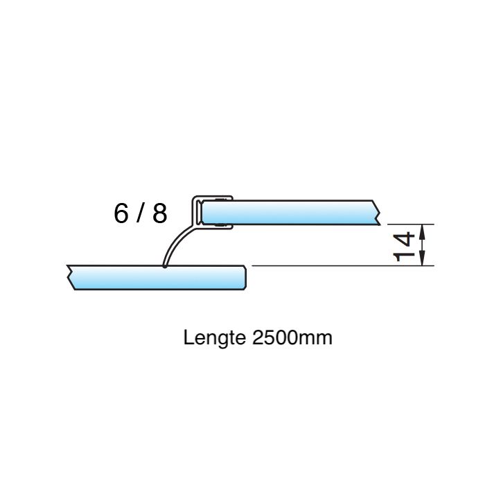 Voorbeeld: Bij gebruik van de strip (lengte 2500mm) i.c.m. 6mm schuift het glas tussen de randjes door tegen het einde van de strip en bij 8mm komt het glas tegen de randjes aan.