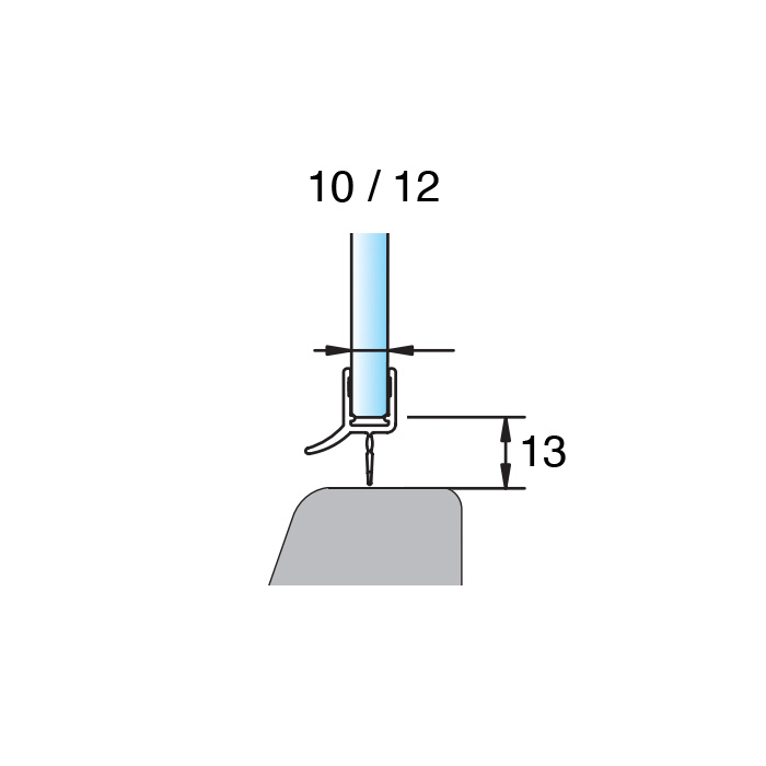 Voorbeeld: Bij gebruik van de strip i.c.m. 10mm schuift het glas tussen de randjes door tegen het einde van de strip en bij 12mm komt het glas tegen de randjes aan.