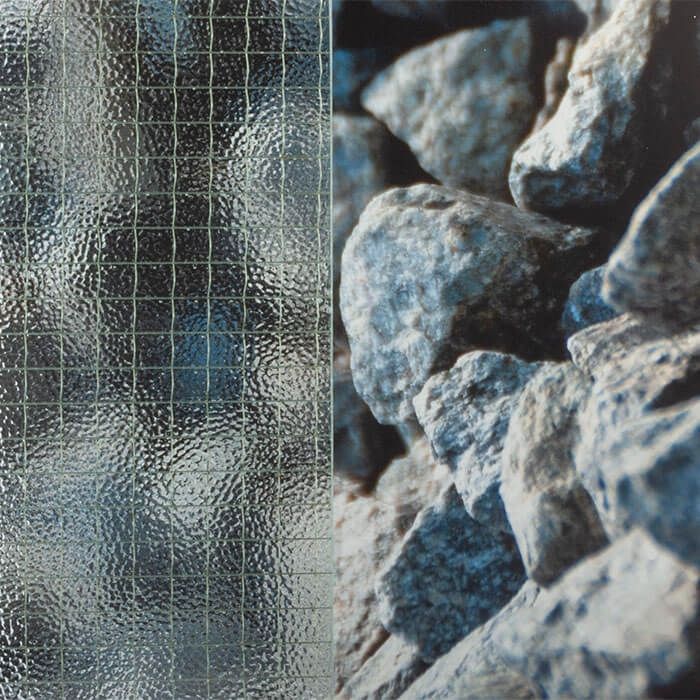 Enkel Engels S draadglas is ongehard vensterglas versterkt met een vlechtwerk van ijzerdraad en kan worden gebruikt voor b.v. tussendeuren, binnenruiten. ruiten in kozijnen enz.
