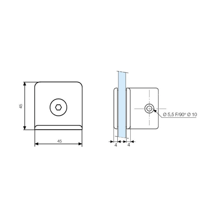 Deze glasklem is bedoeld voor wand-glas bevestigingen met zijdelingse bevestiging in een hoek van 90º.