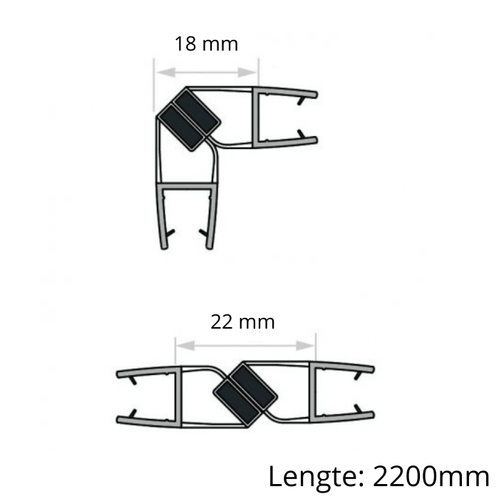 Deze zwarte douchestrip, met magneetsluiting in een hoek van 90 graden, is geschikt voor het afdichten van enkelwerkende douchedeuren. Dit kan een opstelling zijn van dubbele douchedeuren-, of van een douchedeur en douchewand in een haakse hoek geplaatst. De universele strips worden als paar geleverd en kunnen eenvoudig op de zijkanten van het glas worden geschoven. Het is belangrijk dat er voldoende ruimte beschikbaar is tussen het glas (zie technische tekening).