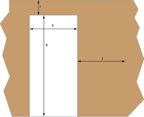 Let op dat de ruimte boven de muur-opening (1) minimaal 250mm is, en de ruimte aan de kant waar de schuifdeur open schuift (2) minimaal het zelfde is als afmeting (A).