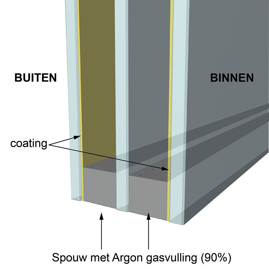 Bij triple glas zit er aan de binnenkant van beide glasplaten een coating, hierdoor is er in tegenstelling tot HR++ glas dus geen voor- of achterzijde van de ruit.