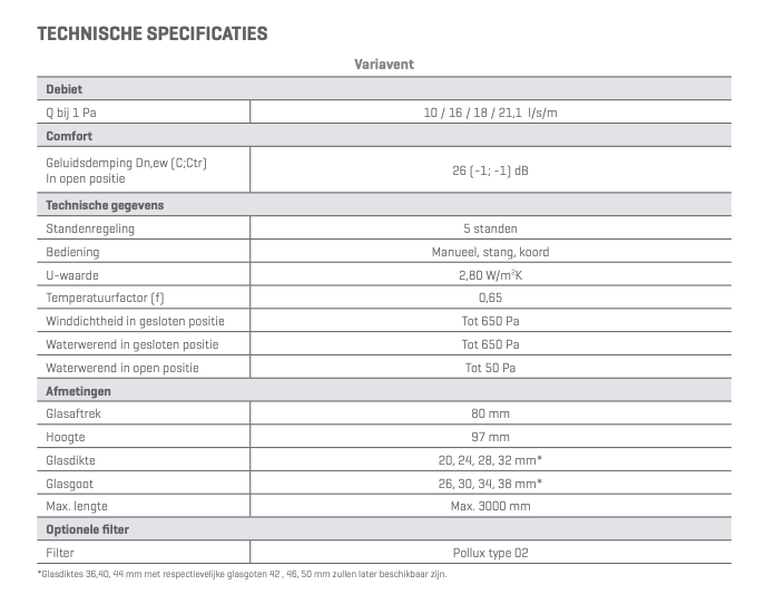 De Variavent is een thermisch geïsoleerd klepventilatierooster voorzien van een zelfregelende klep. De VariaVent is toepasbaar in houten, kunststof en aluminium kozijnen. Het rooster is eenvoudig schoon te maken dankzij een met de hand afneembaar binnenprofiel, dat tevens dienst doet als insectenwering.