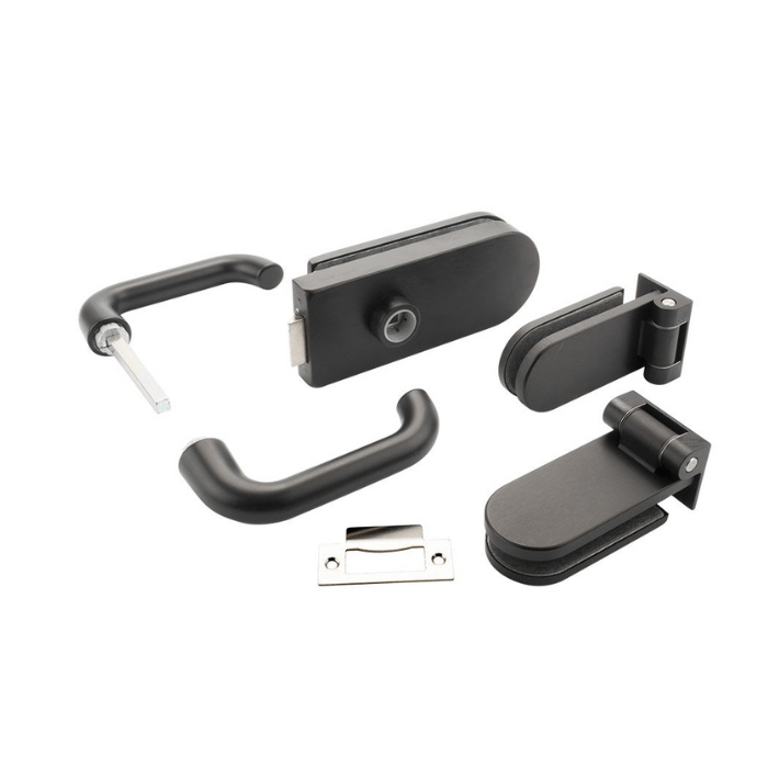 - Deurkruk, loopslot en 2 scharnieren in mat zwart RAL9005